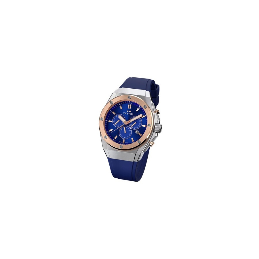 Silver-tone stainless steel case with a blue rubber strap. Fixed rose gold-tone stainless steel bezel. Blue dial with rose gold-tone hands and index hour markers. Minute markers around the outer rim. Dial Type: Analog. Luminescent hands and markers. Date display at the 4 o'clock position. Chronograph - three sub-dials displaying: 60 second, 30 minute and 12 hour. Ronda Caliber 5030.D quartz movement. Scratch resistant sapphire crystal. Screw down crown. Solid case back. Round case shape, case size: 44 mm. Buckle clasp. Water resistant at 100 meters / 330 feet. Functions: chronograph, date, hour, minute, small second. Ceo Tech Series. Casual watch style. Watch label: Swiss Movt. TW Steel CEO Tech Chronograph Quartz Blue Dial Mens Watch CE4046.