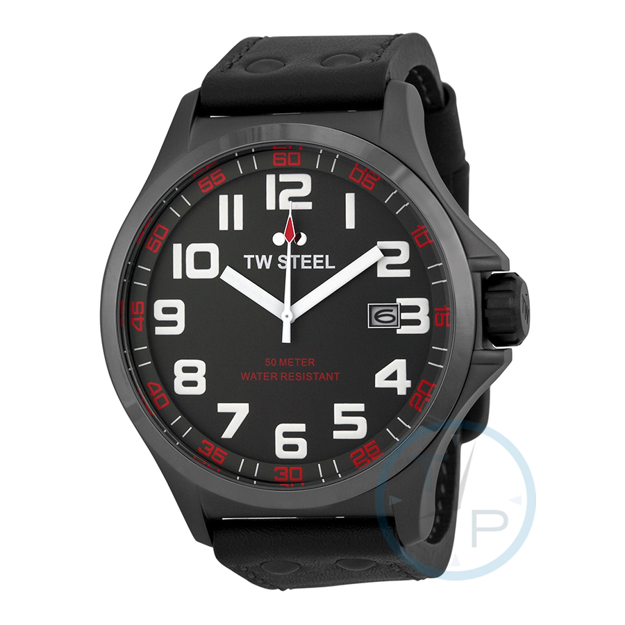 Titanium PVD steel case with a grey leather strap. Fixed titanium PVD bezel. Grey dial with luminous hands and Arabic numeral hour markers. Minute markers around the outer rim. Dial Type: Analog. Luminescent hands and markers. Date display at the 3 o'clock position. Quartz movement. Scratch resistant mineral crystal. Pull / push crown. Solid case back. Case diameter: 48 mm. Case thickness: 12 mm. Round case shape. Band width: 24 mm. Tang clasp. Water resistant at 50 meters / 165 feet. Functions: date, hour, minute, second. Casual watch style. Watch label: Japan Movt. TW Steel Pilot Grey Dial Titanium PVD Stainless Steel Mens Watch TW421.