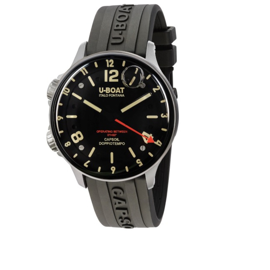 Stainless steel case with a black rubber strap. Fixed silver-tone stainless steel bezel. Black dial with black hands and Arabic numeral & index hour markers. Dial Type: Analog. Luminescent hands and markers. Quartz movement. Scratch resistant sapphire crystal. Screw down crown. Solid case back. Round case shape, case size: 45 mm. Fold over clasp. Water resistant at 100 meters / 330 feet. Functions: date, hour, minute, second. Capsoil Series. Casual watch style. U-Boat Capsoil Quartz Black Dial Mens Watch 8769.