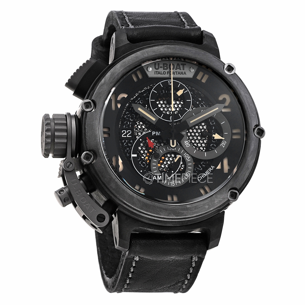 Black titanium case with a black leather strap. Fixed black titanium bezel. Black dial with black hands and Arabic numeral hour markers. Dial Type: Analog. Luminescent hands and markers. Date display at the 9 o'clock position. Automatic movement. Transparent see through case back. Round case shape, case size: 46 mm. Buckle clasp. Water resistant at 50 meters / 165 feet. Functions: chronograph, date, hour, minute, second. Additional Info: limited edition 888 units. Chimera Series. Casual watch style. U-Boat Chimera Chronograph Automatic Black Dial Mens Watch 8057.