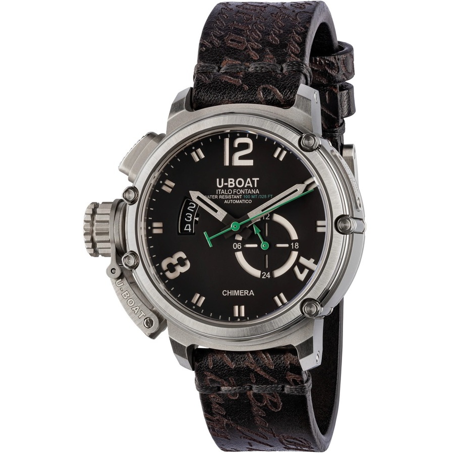 Silver-tone stainless steel case with a black leather strap. Fixed silver-tone stainless steel bezel. Black dial with silver-tone hands and Arabic numeral & index hour markers. Minute markers around the outer rim. Dial Type: Analog. Date display at the 9 o'clock position. Automatic movement. Scratch resistant sapphire crystal. Screw down crown. Transparent see through case back. Round case shape, case size: 46 mm. Buckle clasp. Water resistant at 100 meters / 330 feet. Functions: date, hour, minute, second. Chimera Series. Casual watch style. Watch label: Made in Italy. U-Boat Chimera Automatic Black Dial Mens Watch 8529.