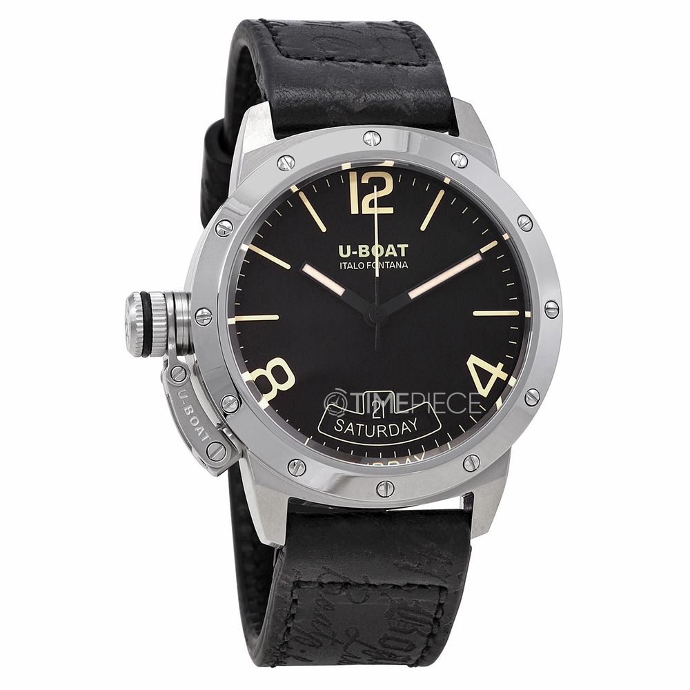 Silver-tone stainless steel case with a black leather strap. Fixed silver-tone stainless steel bezel. Black dial with black hands and Arabic numeral & index hour markers. Minute markers around the outer rim. Dial Type: Analog. Luminescent hands and markers. Date display at the 6 o'clock position. Automatic movement. Scratch resistant sapphire crystal. Transparent see through case back. Round case shape, case size: 40 mm. Buckle clasp. Water resistant at 100 meters / 330 feet. Functions: date, day, hour, minute, second. Classico Series. Casual watch style. U-Boat Classico Automatic Black Dial Mens Watch 8890.
