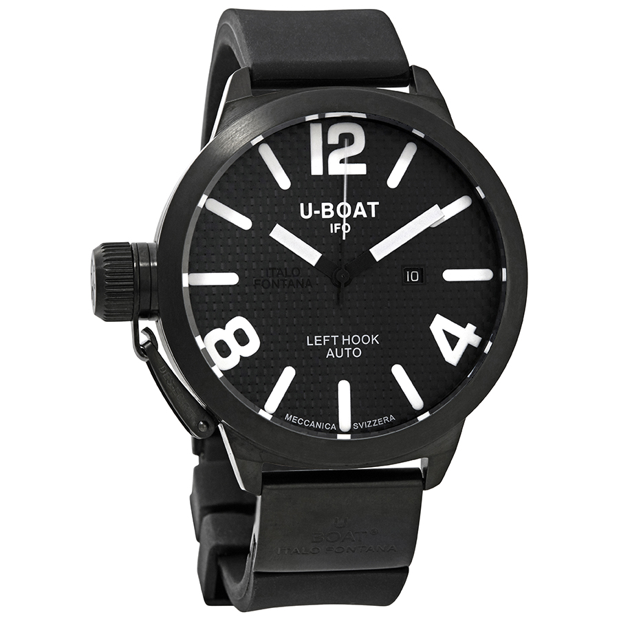 Black stainless steel case with a black polyurethane strap. Fixed silver-tone stainless steel bezel. Black dial with white hands and index and Arabic numeral hour markers. Dial Type: Analog. Date display at the 3 o'clock position. Automatic movement. Scratch resistant sapphire crystal. Left-handed crown. Transparent case back. Round case shape. Case size: 55 mm. Deployment clasp. Water resistant at 100 meters / 330 feet. Functions: date, hour, minute, second. Luxury watch style. Watch label: Swiss Made. U-Boat Classico Black Dial Automatic Mens Watch 1024.