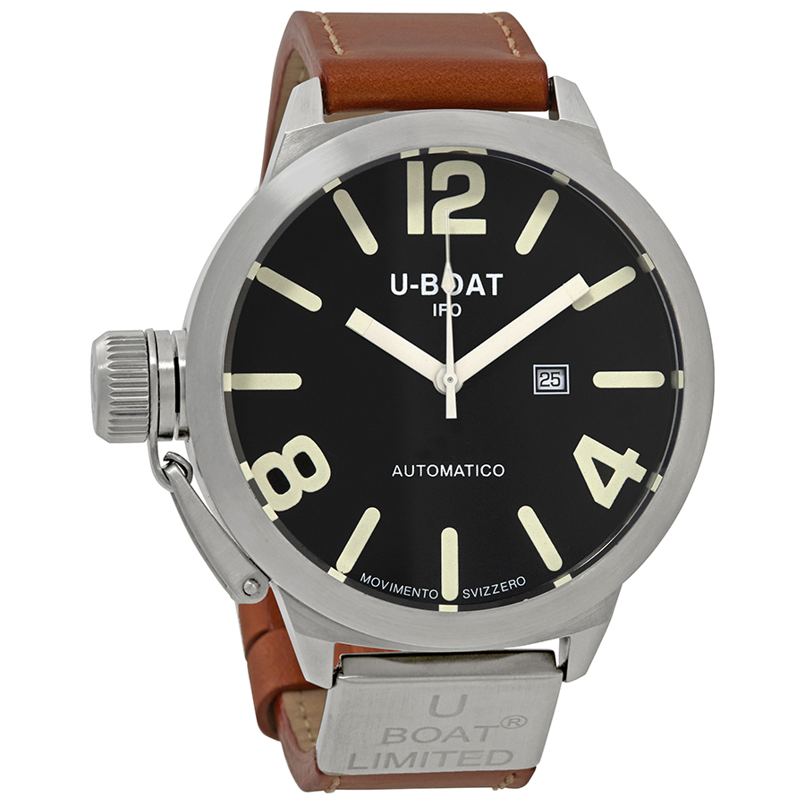 Silver-tone stainless steel case with a tan leather strap. Fixed silver-tone stainless steel bezel. Black dial with silver-tone hands and index-Arabic numerals hour markers. Dial Type: Analog. Luminescent hands and markers. Date display at the 3 o'clock position. ETA Caliber 2824 automatic movement with a 38-hour power reserve. Scratch resistant sapphire crystal. Transparent case back. Round case shape, case size: 53 mm, case thickness: 15 mm. Band width: 23 mm. Buckle clasp. Water resistant at 100 meters / 330 feet. Functions: date, hour, minute, second. Casual watch style. Watch label: Swiss Movt. U-Boat Classico Automatic Black Dial Mens Watch 315.