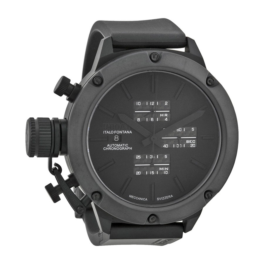 Black ion-plated titanium case with a black rubber strap. Fixed black ion-plated bezel. Black dial with black hands and stick hour markers. Dial Type: Analog. Date display at the 9 o'clock position. Chronograph - three sub-dials displaying: 12 hours, 30 minutes 60 seconds. Automatic movement. Scratch resistant anti-reflective sapphire crystal. Pull / push crown with black ion-plated screw down guard. See through case back sealed with 6 external screws. Case diameter: 53 mm. Case thickness: 17 mm. Band width: 23 mm. Band length: 9 inches. Deployment clasp. Water resistant at 200 meters / 660 feet. Functions: chronograph, date, hour, minute, second. Casual watch style. Watch label: Made In Italy. U-Boat Classico Ceramic Matt Bezel Black Dial Chronograph Mens Watch 6201.