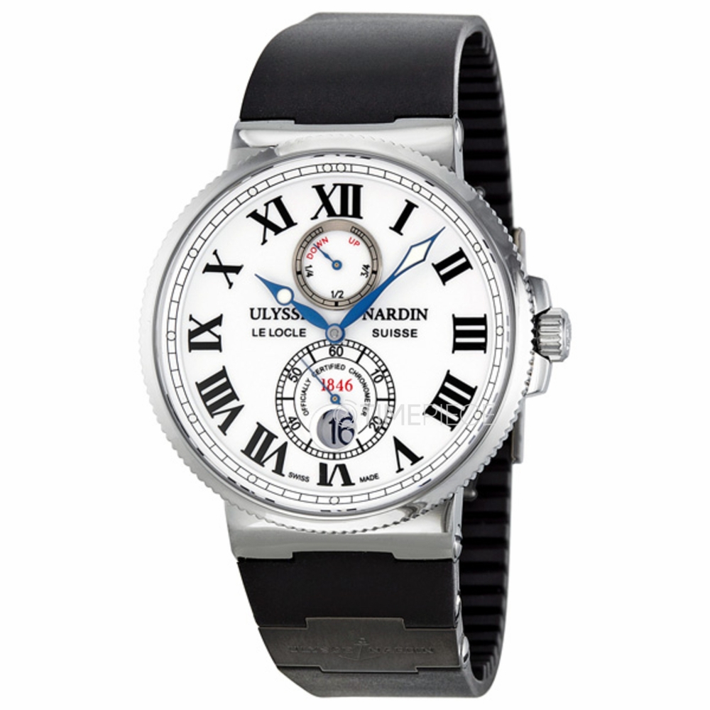 Stainless steel case with a black rubber strap with grey titanium elements. Fixed stainless steel bezel. White dial with luminous blue hands and Roman numeral hour markers. Minute markers around the outer rim. Dial Type: Analog. Luminescent hands. Date display above the 6 o'clock position. Small seconds sub-dial. Power reserve indicator. Ulysse Nardin calibre UN-26 automatic movement, containing 28 Jewels, bitting at 28800 vph, and has a power reserve of approximately 42 hours. Scratch resistant sapphire crystal. Screw down crown. Transparent case back. Round case shape. Case size: 43 mm. Case thickness: 12 mm. Band width: 22 mm. Deployment clasp with a push button release. Water resistant at 200 meters / 660 feet. Functions: date, hour, minute, second, power reserve indicator, chronometer. Maxi Marine Series. Luxury watch style. Watch label: Swiss Made. Ulysse Nardin Maxi Marine Chronometer White Dial Mens Watch 263-67-3-40.
