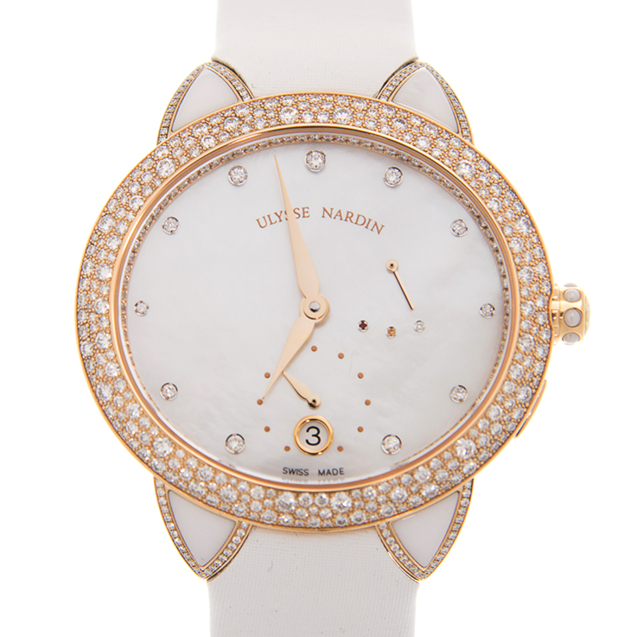Gold-tone 18kt rose gold case with a white silk strap. Fixed gold-tone diamond set bezel. White dial with gold-tone hands and diamond hour markers. Dial Type: Analog. Date display at the 6 o'clock position. Automatic movement. Scratch resistant sapphire crystal. Transparent case back. Round case shape. Case size: 36 mm. Fold over clasp. Functions: hour, minute. Additional Info: original box, international warranty card, manual (complete accessories). Luxury watch style. Watch label: Swiss Made. Ulysse Nardin N/A White Dial Unisex Watch 3106125991.