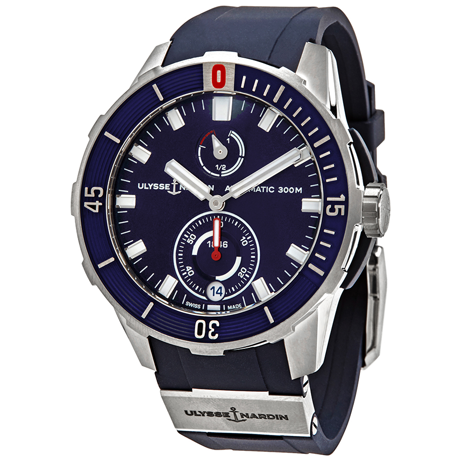 Titanium case with a blue rubber strap with integrated titanium elements. Uni-directional rotating titanium bezel with a blue ring. Blue dial with luminous silver-tone hands and index hour markers. Minute markers around the outer rim. Dial Type: Analog. Luminescent hands and markers. Date display at the 6 o'clock position. Two sub-dials displaying: small second and power reserve indicator. Ulysse Nardin calibre UN-118 automatic movement with a 60-hour power reserve. Scratch resistant sapphire crystal. Screw down crown. Transparent case back. Round case shape. Case size: 44 mm. Case thickness: 13.10 mm. Band width: 22 mm. Tang clasp. Water resistant at 300 meters / 1000 feet. Functions: date, hour, minute, second, power reserve indicator, chronometer. Additional Info: rubber strap with single brushed finished titanium element (brand logo engraved). Dive watch style. Watch label: Swiss Made. Ulysse Nardin Diver Chronometer Automatic Blue Dial Mens Watch 1183-170-3/93.