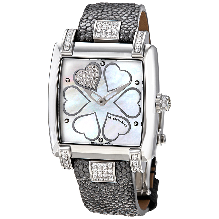 Stainless steel case with a grey satin bracelet. Fixed bezel. Mother of pearl diamond dial with silver-toned hands and diamond hour markers. Dial Type: Analog. Automatic movement. Un-13 engine. Scratch resistant sapphire crystal. Case diameter: 34 mm x 35.4 mm. Rectangle case shape. Water resistant at 50 meters / 165 feet. Functions: hour, minute. Additional Info: dial features heart motifs with diamonds. lugs and strap feature 60 diamonds. Luxury watch style. Watch label: Swiss Made. Ulysse Nardin Caprice Mother of Pearl Diamond Dial Automatic Ladies Watch 133-91C-HEART.