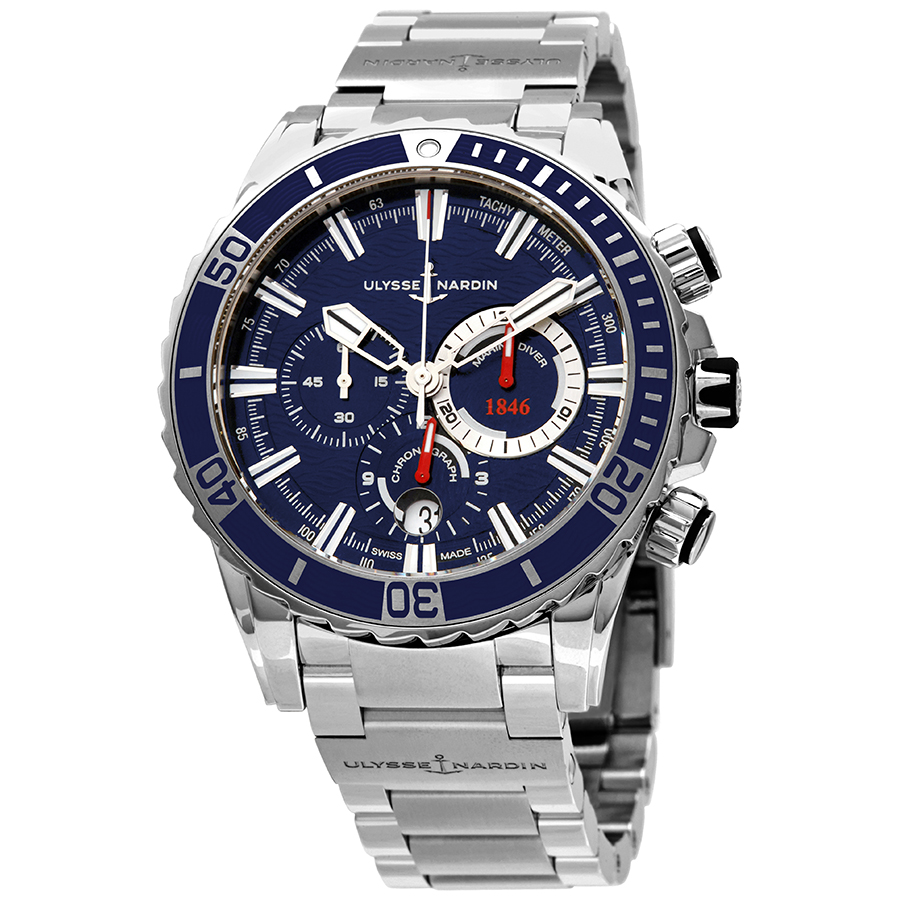 Silver-tone stainless steel case with a silver-tone stainless steel bracelet. Uni-directional rotating black stainless steel with a rubber inlay bezel. Black dial with lumunous silver-tone hands and index hour markers. Minute markers. tachymeter markings around the outer rim. Dial Type: Analog. Luminescent hands and markers. Date display at the 5 o'clock position. Chronograph - three sub-dials displaying: 60 second, 30 minute and 12 hour. Caliber UN-150 automatic movement with a 48-hour power reserve. Scratch resistant sapphire crystal. Screw down crown. Transparent case back. Round case shape. Case size: 44 mm. Fold over with safety release clasp. Water resistant at 300 meters / 1000 feet. Functions: chronograph, tachymeter, date, hour, minute, second. Luxury watch style. Watch label: Swiss Made. Ulysse Nardin Diver Chronograph Automatic Black Dial Mens Watch 1503-151-7M/92.