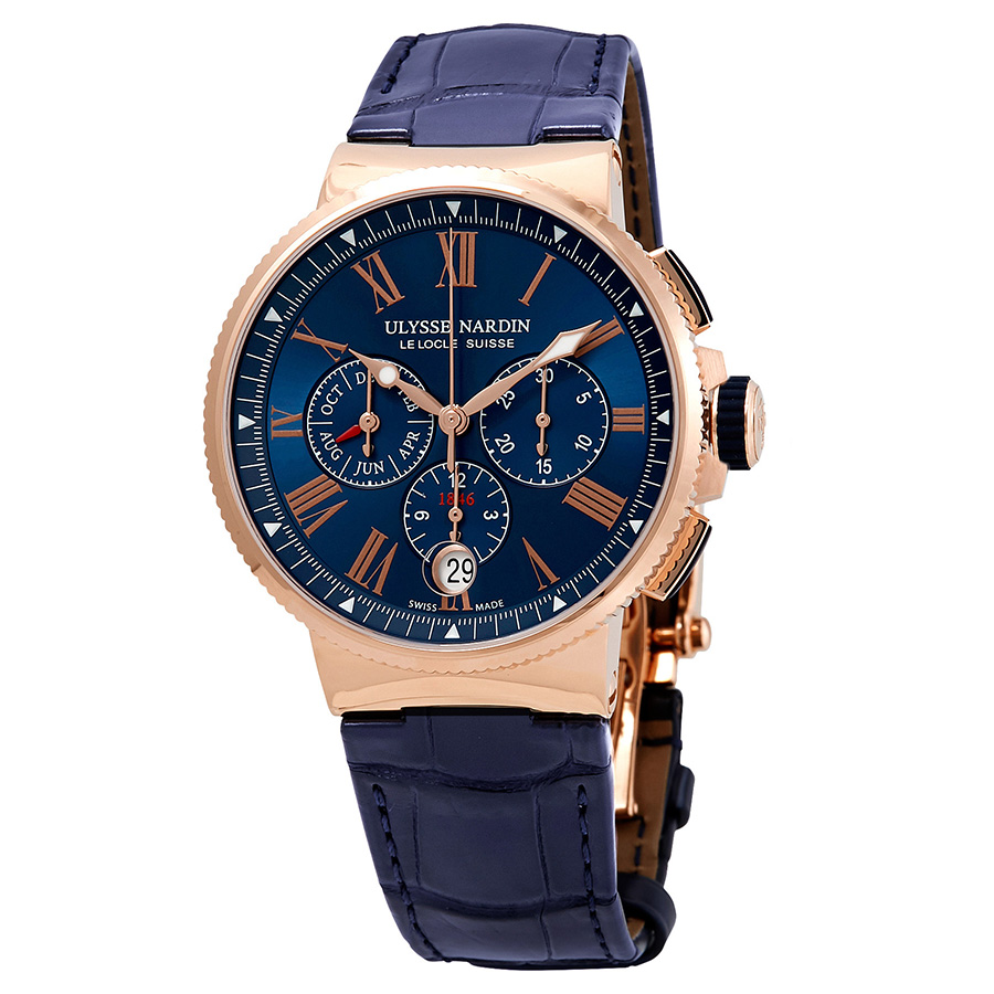 18kt rose gold case with a blue (alligator) leather strap. Fixed 18kt rose gold bezel. Blue dial with luminous rose gold-tone hands and Roman numeral hour markers. Minute markers around the outer rim. Dial Type: Analog. Luminescent hands. Date display at the 6 o'clock position. Chronograph - three sub-dials displaying: 60 second, 30 minute and 12 hours. Ulysse Nardin calibre UN-153 automatic movement with a 52-hour power reserve. Scratch resistant sapphire crystal. Screw down crown. Transparent case back. Round case shape. Case size: 43 mm. Case thickness: 15.20 mm. Band width: 22 mm. Fold over clasp with a push button release. Water resistant at 100 meters / 330 feet. Functions: chronograph, month, date, hour, minute, second, annual calendar. Luxury watch style. Watch label: Swiss Made. Ulysse Nardin Marine Chronograph Automatic Mens Watch 1532-150/43.