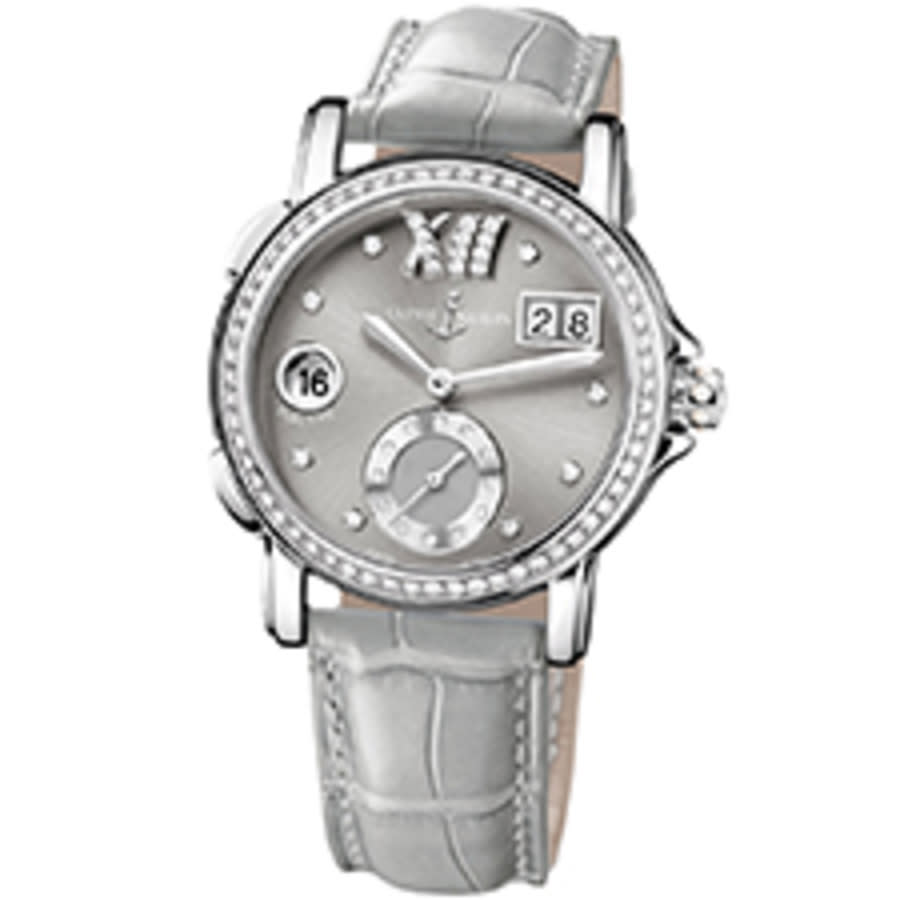 Stainless steel case with a grey leather strap. Fixed bezel set with diamonds bezel. Gray dial with silver-toned hands and diamond hour markers. Dial Type: Analog. Date display at the 2 o'clock position. Small seconds sub-dial. Automatic movement. Scratch resistant sapphire crystal. Screw down crown. Case diameter: 37 mm. Round case shape. Fold over with safety clasp. Water resistant at 100 meters / 330 feet. Functions: date, hour, minute, second. Luxury watch style. Watch label: Swiss Made. Ulysse Nardin Charcoal Diamond Dial Stainless Steel Grey Leather Ladies Watch 243-22B-30-02.