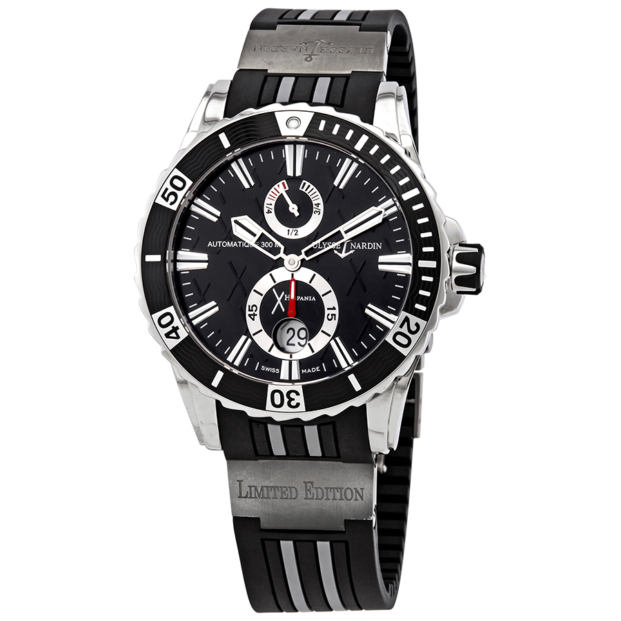 Stainless steel case with a black rubber strap. Uni-directional rotating black bezel. Black dial with silver-tone hands and index hour markers. Minute markers around the outer rim. Dial Type: Analog. Date display at the 6 o'clock position. Ulysse Nardin Calibre UN-26 automatic movement with a 42-hour power reserve. Scratch resistant sapphire crystal. Screw down crown. Round case shape. Case size: 44 mm. Deployment clasp. Water resistant at 300 meters / 1000 feet. Functions: date, hour, minute, second. Luxury watch style. Watch label: Swiss Made. Ulysse Nardin Marine Diver Hispania Black Dial Automatic Mens Watch 263-10LE-3/92-HIS.
