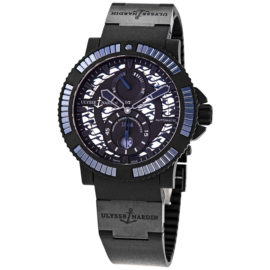 Stainless steel with matte black rubber case with a black rubber and ceramic strap. Uni-directional rotating black and blue ceramic baguettes, rubber bezel. Black sea dial with blue hands and index hour markers. Minute markers around the outer rim. Dial Type: Analog. Luminescent hands and markers. Date display at the 6 o'clock position. Small seconds and power reserve indicator subdials. Ulysse Nardin Calibre UN-26 automatic movement with a 42-hour power reserve. Scratch resistant sapphire crystal. Screw down crown. Transparent case back. Round case shape. Case size: 45.8 mm. Deployment with push button release clasp. Water resistant at 200 meters / 660 feet. Functions: date, hour, minute, second, power reserve indicator, chronometer. Luxury watch style. Watch label: Swiss Made. Ulysse Nardin Diver Automatic Black Sea Dial Mens Watch 263-92B3-3C/923.