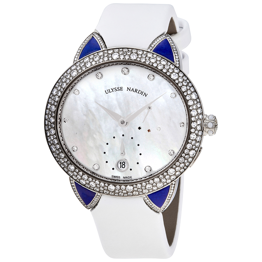 18kt white gold case with a white satin strap. Fixed 18kt white gold diamond set bezel. Mother of pearl dial with silver-tone hands and diamonds hour markers. Dial Type: Analog. Date display at the 6 o'clock position. Two- small seconds, power reserve subdials. Automatic movement with a 48-hour power reserve. Scratch resistant sapphire crystal. Transparent case back. Oval case shape. Case size: 36 x 39 mm. Buckle clasp. Water resistant at 30 meters / 100 feet. Functions: date, hour, minute, second. Luxury watch style. Watch label: Swiss Made. Ulysse Nardin Jade 18kt White Gold Mother of Pearl Diamond Dial Automatic Ladies White Satin Watch 3100-125BCLL/991.