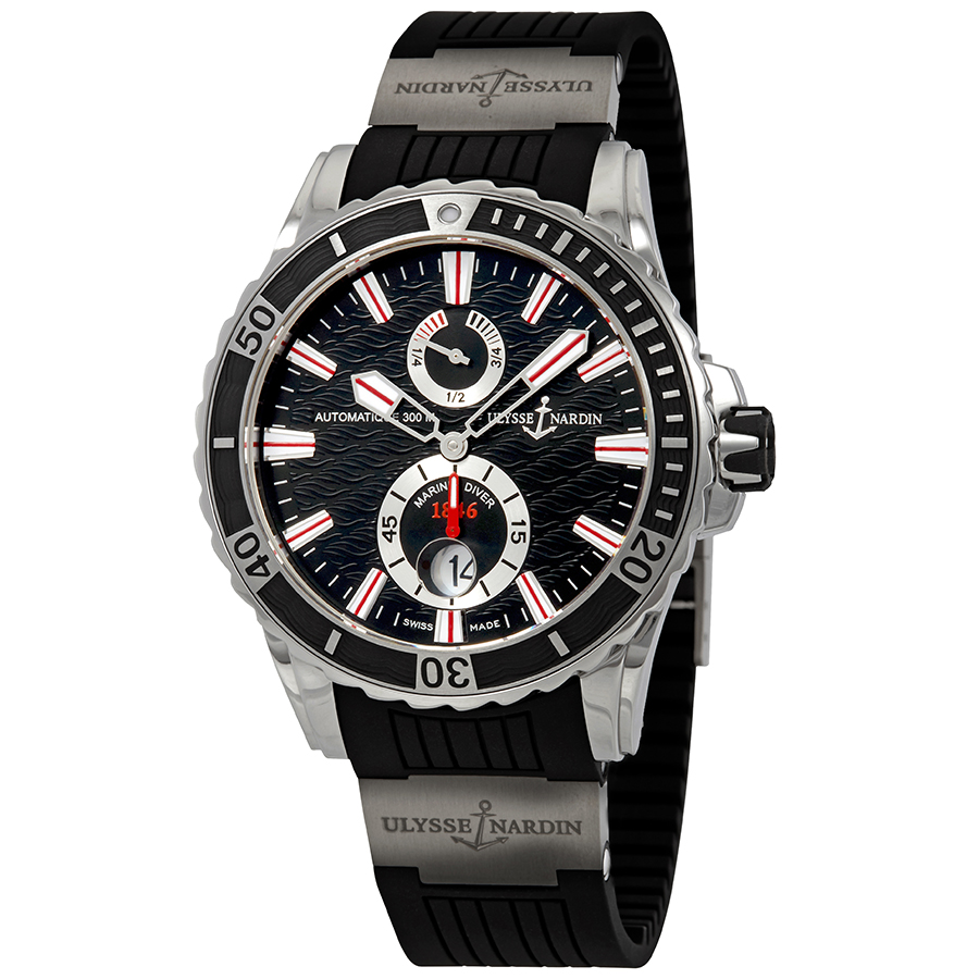 Silver-tone stainless steel case with a black rubber strap. Uni-directional rotating black bezel. Black dial with silver-tone hands and index hour markers. Minute markers around the outer rim. Dial Type: Analog. Luminescent hands and markers. Date display at the 6 o'clock position. Two- small seconds, and power reserve subdials. Automatic movement. Scratch resistant sapphire crystal. Screw down crown. Solid case back. Round case shape. Case size: 44 mm. Water resistant at 300 meters / 1000 feet. Functions: date, hour, minute, second. Dive watch style. Watch label: Swiss Made. Ulysse Nardin Maxi Marine Diver Black Dial Automatic Mens Rubber Watch 362-10-3/92.