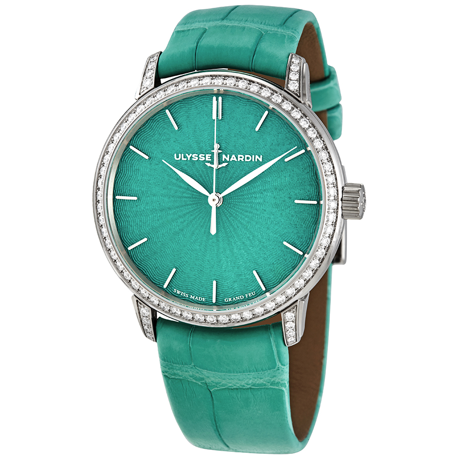 18kt white gold case with a green crocodile leather strap. Fixed 18kt white gold diamond set bezel. Green dial with white hands and index hour markers. Dial Type: Analog. Ulysse Nardin Calibre UN-815 automatic movement with a 42-hour power reserve. Scratch resistant sapphire crystal. Screw down crown. Solid case back. Round case shape. Case size: 37 mm. Buckle clasp. Water resistant at 30 meters / 100 feet. Functions: date, hour, minute, second, chronometer. Dress watch style. Watch label: Swiss Made. Ulysse Nardin Classico Lady Automatic Chronometer Diamond Green Dial Ladies Watch 8150-201BC/E8.