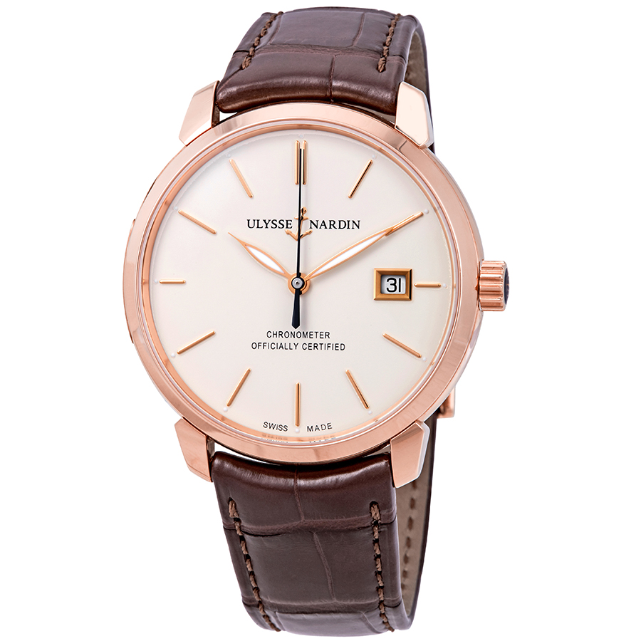 18kt rose gold case with a brown leather strap. Fixed 18kt rose gold bezel. Eggshell dial with index hour markers. Dial Type: Analog. Date display at the 3 o'clock position. Ulysse Nardin Calibre UN-815 automatic movement. Scratch resistant sapphire crystal. Round case shape. Case size: 40 mm. Water resistant at 50 meters / 165 feet. Functions: date, hour, minute, second. Luxury watch style. Watch label: Swiss Made. Ulysse Nardin Classic Classico Eggshell Dial Automatic Mens 18kt Rose Gold Watch 8152-111-2/91.