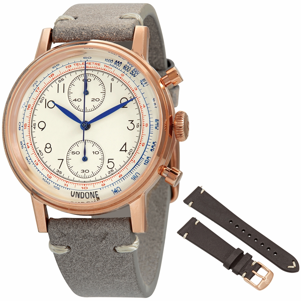 Gold-tone stainless steel case with a leather strap. Fixed gold-tone bezel. White dial with blue hands and Arabic numeral hour markers. Minute markers around the outer rim. Dial Type: Analog. TMI VK61 quartz movement. Scratch resistant hardened domed K1 crystal crystal. Solid case back. Round case shape, case size: 40 mm, case thickness: 12.7 mm. Band length: 9.8. Buckle clasp. Water resistant at 30 meters / 100 feet. Functions: chronograph, hour, minute, second. Undone Watch URB-VNT-KILLY-SET.