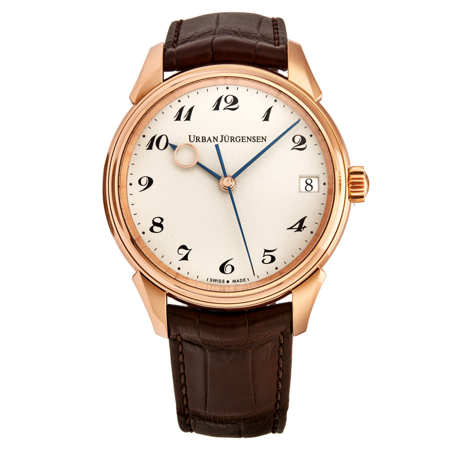 Rose gold-tone 18kt rose gold case with a brown leather strap. Fixed rose gold-tone 18kt rose gold bezel. Silver-tone dial with blue hands and Arabic numeral hour markers. Minute markers around the outer rim. Dial Type: Analog. Date display at the 3 o'clock position. Hand wind movement. Scratch resistant sapphire crystal. Screw down crown. Transparent see through case back. Round case shape, case size: 40 mm. Buckle clasp. Functions: date, hour, minute, second. Jule Series. Luxury watch style. Watch label: Swiss Made. Urban Jurgensen Jule Silver-tone Dial Mens Watch 2240 RG.