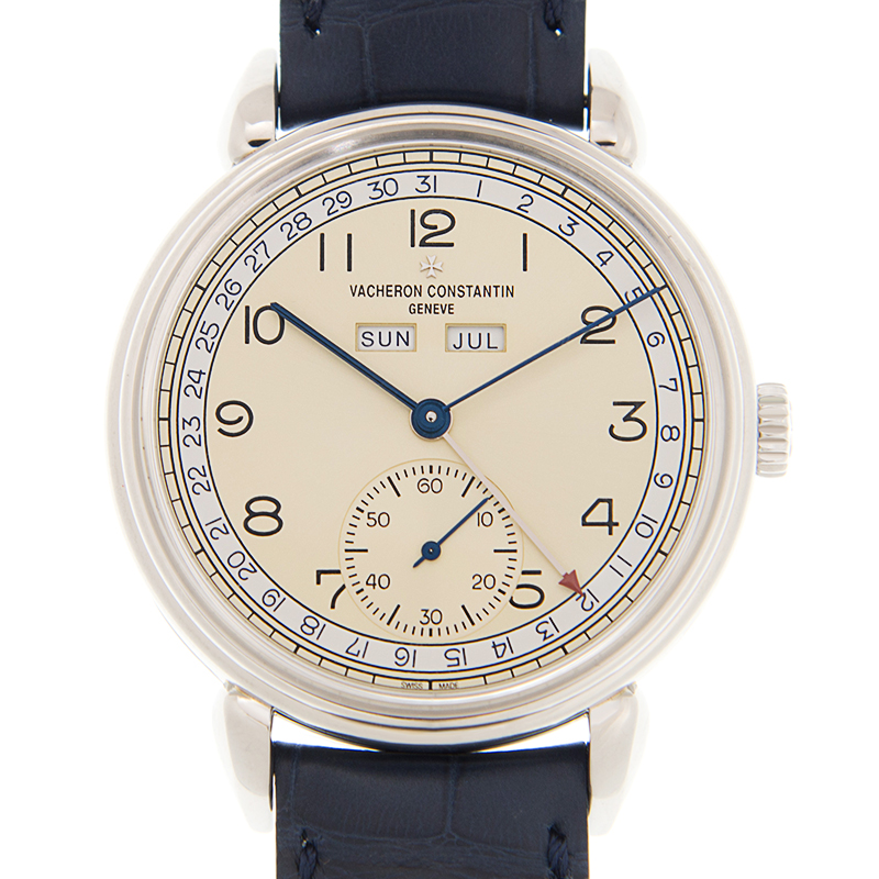 Silver-tone stainless steel case with a dark blue alligator mississippiensis leather strap. Fixed silver-tone stainless steel bezel. Silver-tone dial with blue hands and Arabic numeral hour markers. Date markers around the outer rim. Dial Type: Analog. Day and month display at the 12 o'clock position. One subdial displaying: small second. Vacheron Constantin Calibre 4400 QC Hand Wind movement, containing 21 Jewels, composed of 225 parts, bitting at 28800 vph, and has a power reserve of approximately 65 hours. Scratch resistant sapphire crystal. Pull / push crown. Transparent case back. Round case shape, case size: 40 mm, case thickness: 10.35 mm. Ardillon buckle clasp. Water resistant at 30 meters / 100 feet. Functions: month, day, date, hour, minute, small second. Historiques Triple Calendrier 1942 Series. Luxury watch style. Watch label: Swiss Made. Vacheron Constantin Historiques Triple Calendrier 1942 Mechanical Silver Dial Mens Watch 3110V-000A-B426.