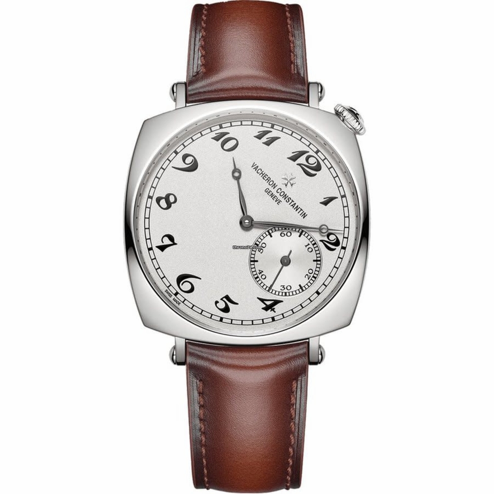 18kt white gold case with a brown calfskin band. Fixed 18kt white gold bezel. White dial with black hands and Arabic numeral hour markers. Minute markers around the outer rim. Dial Type: Analog. One subdial displaying: small second. Vacheron Constantin Calibre 4400 AS Hand Wind movement, containing 21 Jewels, composed of 127 parts, bitting at 28800 vph, and has a power reserve of approximately 65 hours. Scratch resistant sapphire crystal. Transparent see through case back. Square case shape, case size: 36.5 mm. Buckle clasp. Water resistant at 30 meters / 100 feet. Functions: hour, minute, small second. Historiques American 1921 Series. Dress watch style. Watch label: Swiss Made. Vacheron Constantin Historiques American 1921 White Dial Mens Watch 1100s / 000g-b734.