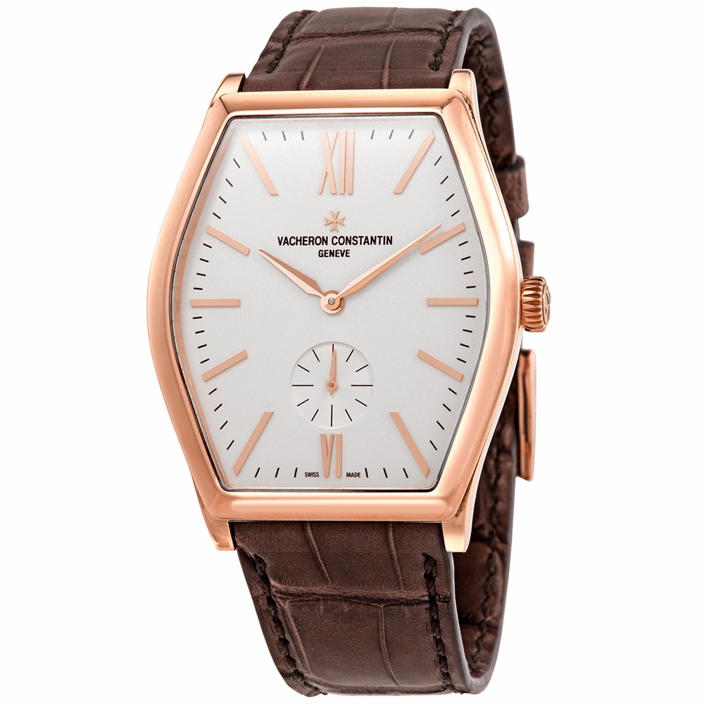 18kt pink gold case with a dark brown (alligator) leather strap. Fixed 18kt pink gold bezel. Silver dial with gold-tone hands and index hour markers. Roman numerals mark the 6 and 12 o'clock positions. Minute markers around the outer rim. Dial Type: Analog. Small seconds sub-dial. Vacheron Constantin calibre 4400 AS Hand Wind movement, containing 21 Jewels, composed of 127 parts, bitting at 28800 vph, and has a power reserve of approximately 65 hours. Scratch resistant sapphire crystal. Pull / push crown. Transparent case back. Tonneau case shape. Case dimensions: 47.61 mm x 36.70 mm. Cse thickness: 9.25 mm. Tang clasp. Water resistant at 30 meters / 100 feet. Functions: hour, minute, small seconds. Malte Series. Luxury watch style. Watch label: Swiss Made. Item Variations: 82230000R-9963 , 82230/000R-9963 , X82R7754. Vacheron Constantin Malte Silver Dial Mens Watch 82230/000R-9963.