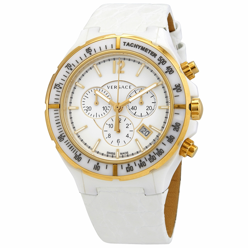 White ceramic case with a white leather strap. Fixed rose gold ion-plated bezel with a white ceramic inlay showing tachymeter markings. White dial with luminous rose gold-tone hands and index hour markers. Arabic numeral appears atthe 12 o'clock position. Minute markers around the outer rim. Dial Type: Analog. Luminescent hands. Date display between the 4 and 5 o'clock positions. Chronograph - three sub-dials displaying: 60 second, 30 minute and 12 hour. Quartz movement. Scratch resistant mineral crystal. Solid case back. Round case shape. Case size: 44 mm. Case thickness: 7 mm. Band width: 18 mm. Tang clasp. Water resistant at 50 meters / 165 feet. Functions: chronograph, date, hour, minute, second. Dress watch style. Watch label: Swiss Made. Versace Chronograph Quartz White Dial Ladies Watch 28CCP1D001S001.