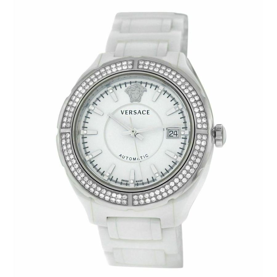 White ceramic case and bracelet. Fixed white ceramic bezel. White dial with silver-tone hands and index hour markers. Minute markers around the outer rim. Dial Type: Analog. Date display at the 3 o'clock position. Automatic movement. Scratch resistant sapphire crystal. Transparent see through case back. Round case shape, case size: 43 mm. Deployment with push button release clasp. Water resistant at 50 meters / 165 feet. Functions: date, hour, minute, second. Dv One Series. Casual watch style. Watch label: Swiss Made. Versace DV One Automatic White Dial Ladies Watch 02ACS11D001.