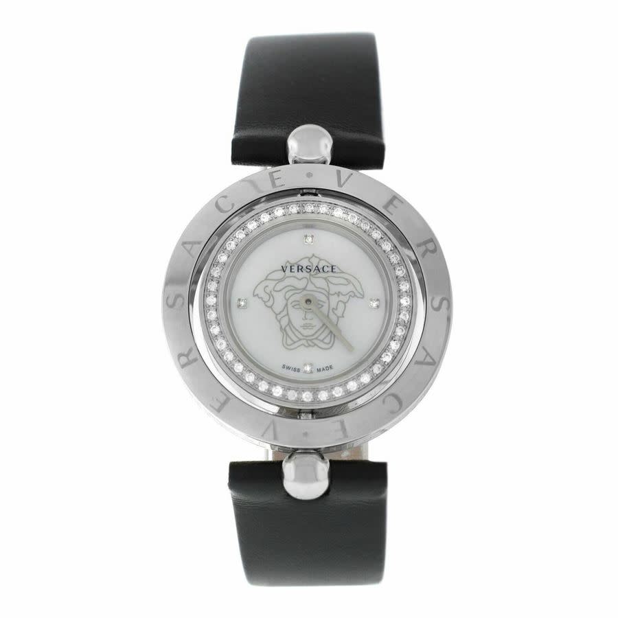 Silver-tone stainless steel case with a black leather strap. Fixed silver-tone stainless steel bezel. Mother of pearl dial with silver-tone hands and diamond hour markers. Dial Type: Analog. Quartz movement. Scratch resistant sapphire crystal. Solid case back. Round case shape, case size: 33 mm. Buckle clasp. Functions: hour, minute. Eon Series. Casual watch style. Watch label: Swiss Made. Versace EON Quartz Diamond Ladies Watch 79Q91SD497.