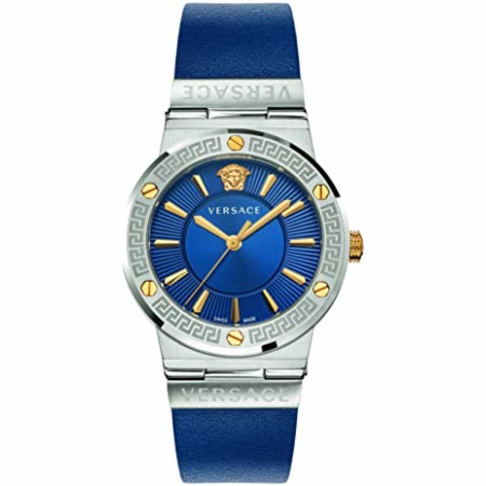 Silver-tone stainless steel case with a blue leather strap. Fixed silver-tone stainless steel bezel. Blue dial with gold-tone hands and index hour markers. Medusa head embellishment at 12 o’clock position. Dial Type: Analog. Quartz movement. Scratch resistant sapphire crystal. Pull / push crown. Solid case back. Round case shape, case size: 38 mm. Folding clasp. Water resistant at 50 meters / 165 feet. Functions: hour, minute, second. Greca Series. Casual watch style. Watch label: Swiss Made. Versace Greca Quartz Blue Dial Ladies Watch VEVH00120.
