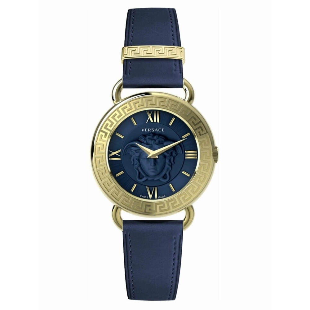 Gold-tone stainless steel case with a blue leather strap. Fixed gold-tone stainless steel bezel. Blue dial with gold-tone hands and index-Roman numeral hour markers. Roman numeral marker appears at the 3, 6, 9 and 12 o'clock positions. Dial Type: Analog. Quartz movement. Scratch resistant sapphire crystal. Pull / push crown. Solid case back. Round case shape, case size: 36 mm. Band width: 16 mm. Water resistant at 50 meters / 165 feet. Functions: hour, minute. Medusa Series. Casual watch style. Watch label: Swiss Made. Versace Medusa Quartz Blue Dial Ladies Watch VEPU01121.