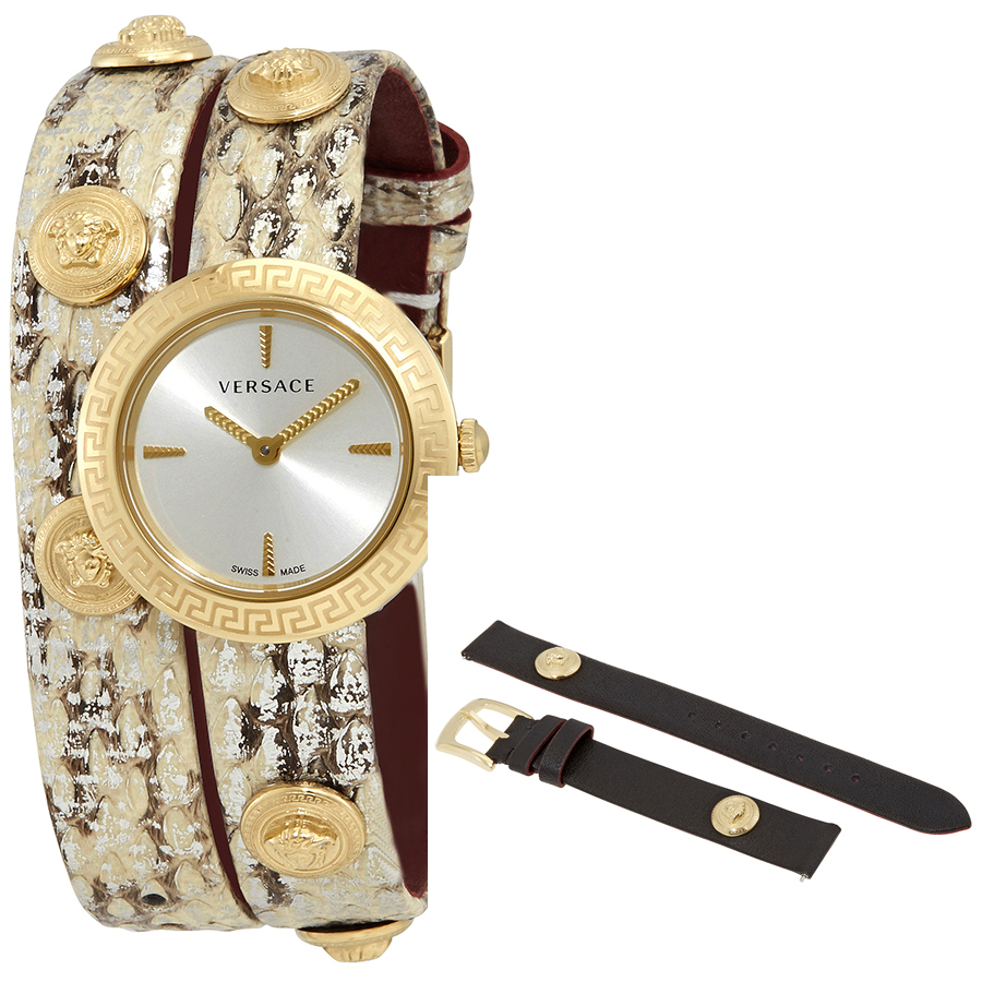 Gold-tone stainless steel case with a grey and beige leather double wrap strap set with gold-tone Medusa studs. Fixed gold-tone (greca embossed) bezel. Silver dial with gold-tone hands. Index markers at the 3, 6, 9 and 12 o'clock positions. Dial Type: Analog. Quartz movement. Scratch resistant sapphire crystal. Pull / push crown. Solid case back. Round case shape. Case size: 28 mm. Case thickness: 7 mm. Band width: 12 mm. Tang clasp. Water resistant at 50 meters / 165 feet. Functions: hour, minute, small second. Dress watch style. Watch label: Swiss Made. Versace Medusa Stud Icon Quartz Silver Dial Ladies Watch VERF00118.