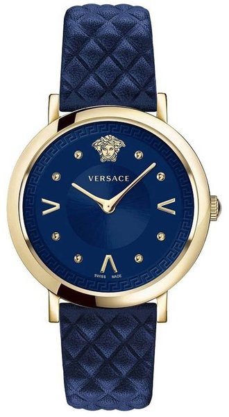 Gold-tone stainless steel case with a blue (quilt pattern) leather strap. Fixed gold-tone bezel. Blue (greca pattern) dial with gold-tone hands and dot hour markers. V markers at the 3, 6 and 9 o'clock positions. The Medusa Head logo appears at the 12 o'clock position. Dial Type: Analog. Quartz movement. Scratch resistant sapphire crystal. Pull / push crown. Solid case back. Round case shape. Case size: 36 mm. Case thickness: 8 mm. Band width: 18 mm. Tang clasp. Water resistant at 50 meters / 165 feet. Functions: hour, minute. Pop Chic Series. Dress watch style. Watch label: Swiss Made. Versace Pop Chic Quartz Blue Dial Ladies Watch VEVD00319.