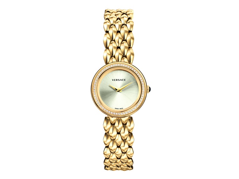 Gold-tone stainless steel case and bracelet. Fixed gold-tone bezel set with diamonds. Silver dial with gold-tone hands. No markers. Dial Type: Analog. Quartz movement. Scratch resistant sapphire crystal. Pull / push crown. Solid case back. Round case shape. Case size: 28 mm. Case thickness: 7.10 mm. Band width: 14 mm. Fold over clasp. Water resistant at 30 meters / 100 feet. Luxury watch style. Watch label: Swiss Made. Versace Quartz Silver Dial Ladies Watch VEBN00918.