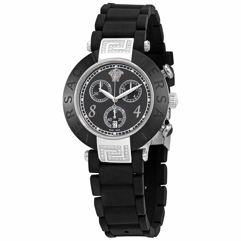 Stainless steel case with a black ceramic bracelet with a black rubber center. Fixed black ceramic bezel with diamond-set stainless steel lugs. Black dial with silver-tone hands and diamond hour markers. Arabic numerals appear at the 4 and 8 o'clock positions. Minute markers around the outer rim. Dial Type: Analog. Date display at the 6 o'clock position. Chronograph - three sub-dials displaying: 60 second, 30 minute and 1/10th of a second. Quartz movement. Scratch resistant sapphire crystal. Pull / push crown. Solid case back. Round case shape. Case size: 43 mm. Case thickness: 10 mm. Band width: 20 mm. Butterfly clasp. Water resistant at 50 meters / 165 feet. Functions: chronograph, date, hour, minute, second. Reve Series. Dress watch style. Watch label: Swiss Made. Versace Reve Chronograph Quartz Black Dial Ladies Watch 92CCS91D008S009.