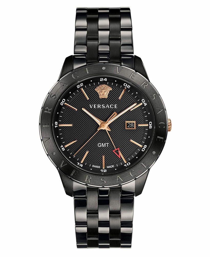 Black ion-plated stainless steel case and bracelet. Fixed black ion-plated bezel. Black dial with lumninous rose gold-tone hands and index hour markers. Minute markers. 24 hour (GMT) markers around the outer rim. The Medusa Head logo appears atthe 12 o'clock position. Dial Type: Analog. Luminescent hands. Date display at the 3 o'clock position. Quartz movement. Scratch resistant sapphire crystal. Pull / push crown. Solid case back. Round case shape. Case size: 43 mm. Case thickness: 8.2 mm. Band width: 21 mm. Fold over clasp with a safety release. Water resistant at 30 meters / 100 feet. Functions: date, hour, minute, second, GMT. Univers Series. Dress watch style. Watch label: Swiss Made. Versace Univers GMT Quartz Black Dial Mens Watch VEBK00618.