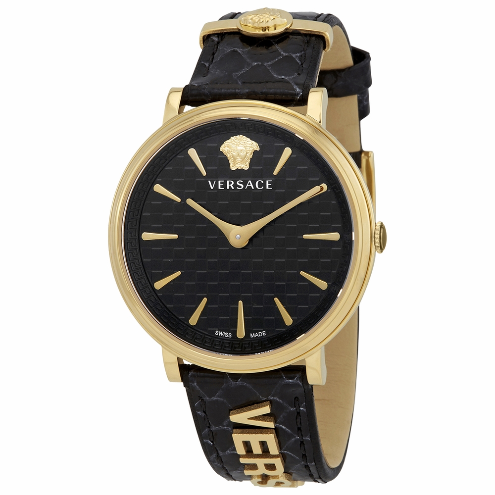 Yellow gold-tone stainless steel case with a black leather strap. Fixed yellow gold-tone bezel. Black dial with yellow gold-tone hands and index hour markers. The Medusa Head logo appears at the 12 o'clock position. Dial Type: Analog. Quartz movement. Scratch resistant sapphire crystal. Pull / push crown. Solid case back. Round case shape. Case size: 38 mm. Case thickness: 7.5 mm. Band width: 18 mm. Tang clasp. Water resistant at 50 meters / 165 feet. Functions: hour, minute. V Circle Series. Dress watch style. Watch label: Swiss Made. Versace V Circle Quartz Black Dial Ladies Watch VE8101019.