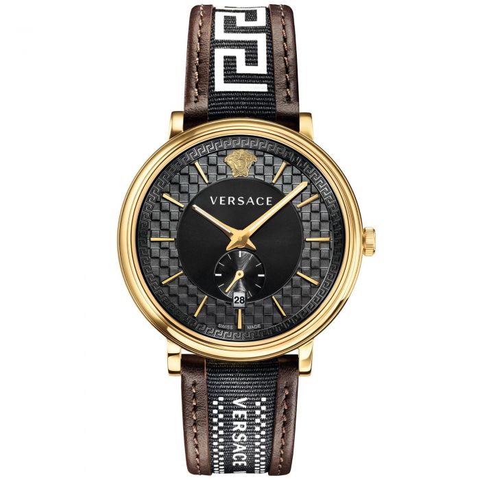 Gold ion-plated stainless steel case with a brown leather strap with a black nylon center. Fixed gold ion-plated bezel. Black (greca embossed) dial with luminous gold-tone hands and index hour markers. The Medusa Head logo appears at the 12 o'clock position. Dial Type: Analog. Luminescent hands. Date display above the 6 o'clock position. Small seconds sub-dial. Quartz movement. Scratch resistant sapphire crystal. Pull / push crown. Solid case back. Round case shape. Case size: 42 mm. Case thickness: 7 mm. Band width: 20 mm. Tang clasp. Water resistant at 50 meters / 165 feet. Functions: date, hour, minute, second. V-circle Series. Dress watch style. Watch label: Swiss Made. Versace V-Circle Quartz Black Dial Mens Watch VEBQ01619.