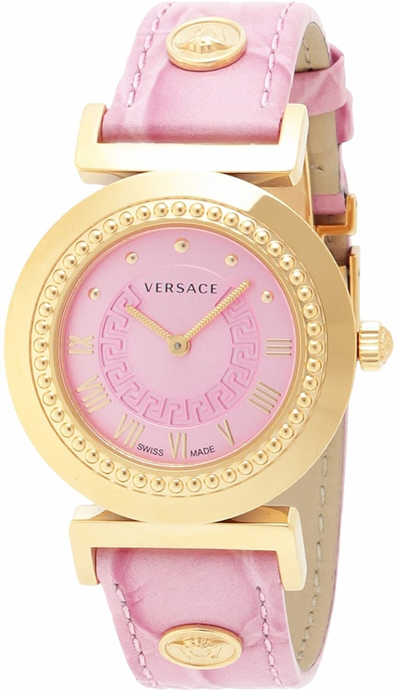 Yellow gold-tone stainless steel case with a pink leather strap. Fixed yellow gold-tone bezel. Pink dial with yellow gold-tone hands and Roman numeral and dot hour markers. Dial Type: Analog. Ronda caliber 762 quartz movement. Scratch resistant sapphire crystal. Pull / push crown. Solid case back. Round case shape. Case size: 34.7 mm. Case thickness: 7.5 mm. Band width: 18 mm. Deployment clasp. Water resistant at 30 meters / 100 feet. Functions: hour, minute. Vanity Series. Casual watch style. Watch label: Swiss Made. Versace Vanity Quartz Pink Dial Ladies Watch P5Q80D111S111.