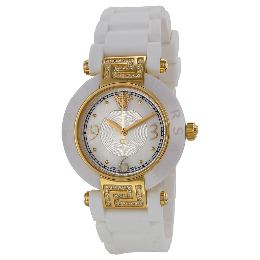 White ceramic case with a white rubber strap. Fixed white ceramic bezel with gold ion-plated lugs set with diamonds. Mother of pearl (silver guilloche) dial with gold-tone hands and gold bead hour markers. Arabic numerals mark the 3, 6 and 9 o'clock positions. Minute markers around the outer rim. The Medusa Head logo appears at the 12 o'clock position. Dial Type: Analog. Quartz movement. Scratch resistant sapphire crystal. Pull / push crown. Solid case back. Round case shape. Case size: 35 mm. Case thickness: 8 mm. Band width: 19 mm. Deployment clasp. Water resistant at 50 meters / 165 feet. Functions: hour, minute, second. Reve Series. Casual watch style. Watch label: Swiss Made. Item Variations: 92QCP11D497 S001, 92QCP11D497.S001, 92QCP11D497S001. Versace Reve White Mother of Pearl Dial White Ceramic Ladies Watch 92QCP11D497-S001.