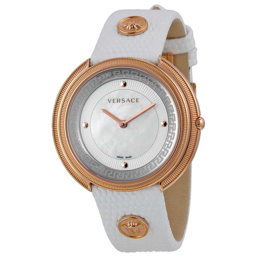 Rose gold-plated stainles steel case with a white leather strap with two Medusa studs. Fixed rose gold-plated bezel. Mother of pearl dial (Greca Pattern) with rose gold-tone hands. Dot markers at the 3, 6, 9 and 12 o'clock positions. Dial Type: Analog. Quartz movement. Scratch resistant sapphire crystal. Solid case back. Case diameter: 39 mm. Case thickness: 9 mm. Round case shape. Band width: 18 mm. Slip through deployment clasp. Water resistant at 30 meters / 100 feet. Functions: hour, minute. Dress watch style. Watch label: Swiss Made. Versace Thea Mother of Pearl Dial White Leather Ladies Watch VA7030013.