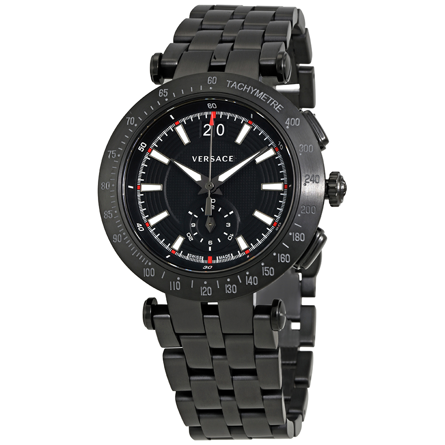 Black ion-plated case with a black ion-plated stainless steel bracelet. Fixed black ion-plated stainless steel showing tachymeter markers bezel. Black dial with luminous black hands and index hour markers. Minute markers around the outer rim. Dial Type: Analog. Luminescent hands and markers. Date display at the 12 o'clock position. Chronograph - sub-dials displaying: 30 minutes (inner 12 hours). Quartz movement. Scratch resistant sapphire crystal. Solid case back. Round case shape, case size: 42 mm, case thickness: 11.5 mm. Band width: 22 mm. Deployment with push button release clasp. Water resistant at 50 meters / 165 feet. Functions: chronograph, tachymeter date, hour, minute, second. Additional Info: comes with an additional leather band. suitable for short periods of recreational swimming, but not diving or snorkeling. Sport watch style. Watch label: Swiss Made. Versace V-Race Chronograph Black Dial Mens Watch VAH04 0016.