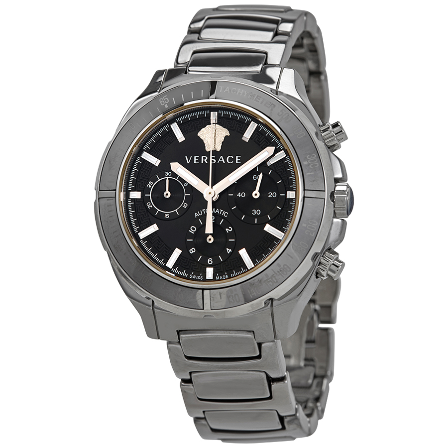 Stainless steel case with a stainless steel bracelet. Fixed bezel. Black dial with index hour markers. Tachymeter. Dial Type: Analog. Luminescent hands and markers. Chronograph - sub-dials displaying: three - 60 second, 30 minute and 12 hour. Automatic movement. Scratch resistant sapphire crystal. Transparent case back. Round case shape. Case size: 43 mm. Butterfly clasp. Functions: chronograph, hour, minute, second. Sport watch style. Watch label: Swiss Made. Versace Chronograph Automatic Black Dial Mens Watch VEK800419.