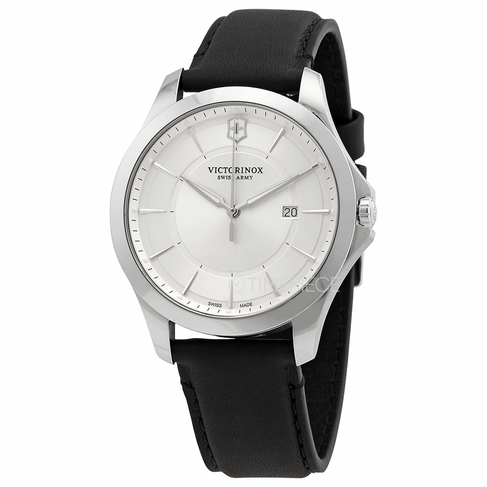 Stainless steel case with a black leather strap. Fixed stainless steel bezel. Silver dial with luminous silver-tone hands and index hour markers. Minute markers around the outer rim. Dial Type: Analog. Luminescent hands and markers. Date display at the 3 o'clock position. Ronda caliber 715 quartz movement. Scratch resistant sapphire crystal. Screw down crown. Solid case back. Round case shape. Case size: 40 mm. Case thickness: 8 mm. Band width: 20 mm. Tang clasp. Water resistant at 100 meters / 330 feet. Functions: date, hour, minute, second. Alliance Series. Casual watch style. Watch label: Swiss Movt. Victorinox Alliance Quartz Silver Dial Mens Watch 241905.