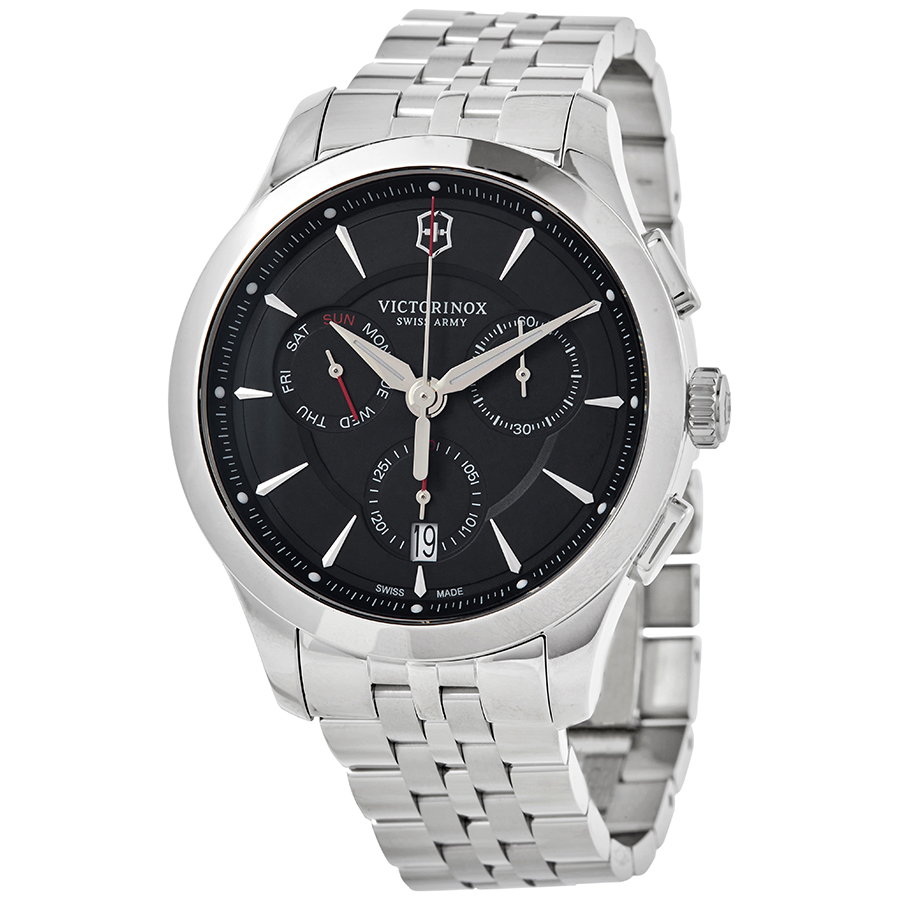 316L stainless steel case with a stainless steel bracelet. Fixed stainless steel bezel. Black dial with luminoussilver-tone hands and index hour markers. Minute markers around the outer rim. Dial Type: Analog. Luminescent hands and markers. Date display at the 6 o'clock position. Chronograph - two sub-dials displaying: 60 second and 30 minute. Day of the week sub-dial. Quartz movement. Scratch resistant mineral crystal. Pull / push crown. Solid case back. Round case shape. Case size: 44 mm. Case thickness: 10.8 mm. Band width: 21 mm. Butterfly clasp. Water resistant at 100 meters / 330 feet. Functions: chronograph, date, hour, minute, second. Additional Info: paired with a pioneer alox Swiss army knife. Sport watch style. Watch label: Swiss Made. Victorinox Alliance Chronograph Quartz Black Dial Mens Watch 241745.1.