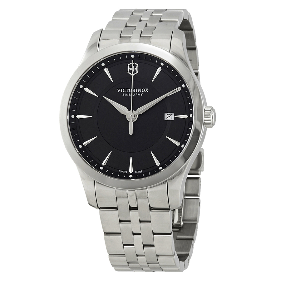 Stainless steel case with a stainless steel bracelet. Fixed stainless steel bezel. Black dial with luminous silver-tone hands and index hour markers. Minute markers around the outer rim. Dial Type: Analog. Luminescent hands and markers. Date display at the 3 o'clock position. Ronda caliber 715 quartz movement. Scratch resistant sapphire crystal. Pull / push crown. Solid case back. Round case shape. Case size: 40 mm. Case thickness: 9.6 mm. Band width: 20 mm. Fold over clasp. Water resistant at 100 meters / 330 feet. Functions: date, hour, minute, second, battery eol indicator. Military watch style. Watch label: Swiss Made. Victorinox Alliance Black Dial Stainless Steel Mens Watch 241801.