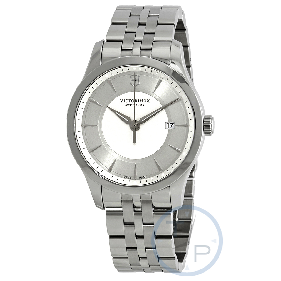 Silver-tone stainless steel case with a silver-tone stainless steel bracelet. Fixed silver-tone stainless steel bezel. White and silver-tone dial with luminous silver-tone hands and index hour markers. Minute markers around the outer rim. Dial Type: Analog. Luminescent hands and markers. Date display at the 3 o'clock position. Ronda caliber 715 quartz movement. Scratch resistant sapphire crystal. Pull / push crown. Solid case back. Round case shape. Case size: 40 mm. Fold over clasp. Water resistant at 100 meters / 330 feet. Functions: date, hour, minute, second, battery eol indicator. Military watch style. Watch label: Swiss Made. Victorinox Alliance Mens Watch 241822.