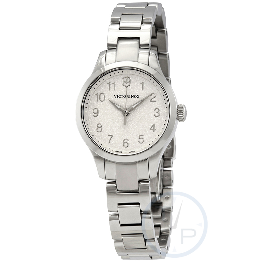 Stainless steel case with a stainless steel bracelet. Fixed stainless steel bezel. Silver dial with luminous silver-tone hands and Arabic numeral hour markers. Minute markers around the outer rim. Dial Type: Analog. Luminescent hands and markers. Quartz movement. Scratch resistant sapphire crystal. Pull / push crown. Solid case back. Round case shape. Case size: 28 mm. Case thickness: 8.1 mm. Band width: 12 mm. Fold over clasp with a push button release. Water resistant at 100 meters / 330 feet. Functions: hour, minute, second. Casual watch style. Watch label: Swiss Made. Victorinox Alliance XS Quartz Silver Dial Ladies Watch 241840.