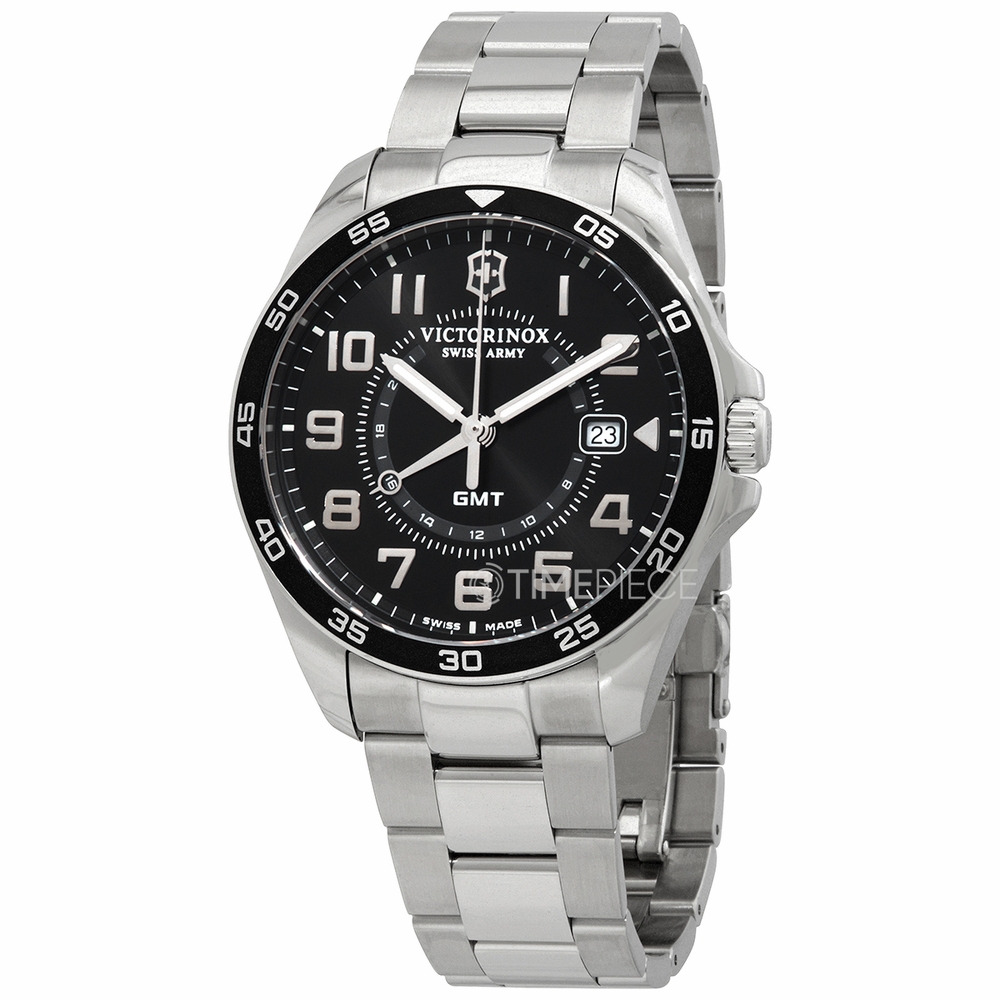 Stainless steel case with a stainless steel bracelet. Uni-directional rotating stainless steel bezel with an inlaid black aluminium ring. Black dial with luminous silver-tone hands and Arabic numeral hour markers. 24 hour markers. Minute markers around the outer rim. Dial Type: Analog. Luminescent hands and markers. Date display at the 3 o'clock position. Ronda caliber 515.24H quartz movement. Scratch resistant sapphire crystal. Solid case back. Round case shape. Case size: 42 mm. Case thickness: 10.5 mm. Band width: 21 mm. Deployment clasp with a push button release. Water resistant at 100 meters / 330 feet. Functions: date, GMT, second time zone, hour, minute, second. Fieldforce Classic Series. Military watch style. Watch label: Swiss Movt. Victorinox Fieldforce Classic Quartz Black Dial Mens Watch 241930.